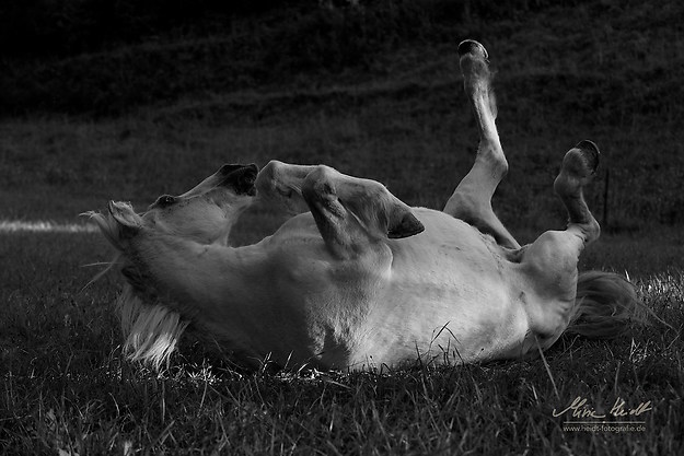 Ohne zuvor ein Bild im Kopf zu haben, entsteht auch kein gutes Foto. Aber manchmal entstehen einfach Situationen wo auch eine große Portion Zufall das Foto mitgestaltet. So auch hier. Geplant waren Portraitfotos dieser Islandstute, die auch gemacht wurden. Und da es ein eher heißer Sommerabend war und die Fliegen plagten, war klar, dass sie sich hinlegen und wälzen würde. Das alleine ist schon erstaunlich, da die Isländerin auf dem Bild stolze 31 Jahre ist und viele alte Pferde sich nicht mehr trauen sich hinzulegen. Aber ich kannte die Stute und wusste, dass sie noch beweglich ist. Dass sie sich aber zum wälzen den einzigen Sonnenfleck auf diesem Weidestück aussuchen würde, das war Zufall. Und er gibt diesem Bild die Würze.