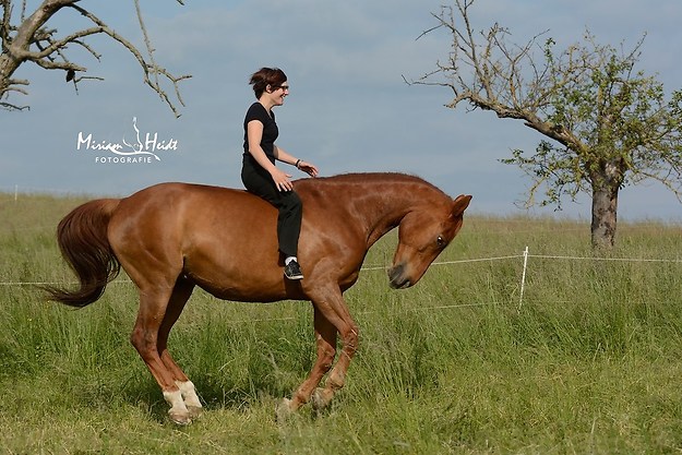 Immer noch eines meiner Lieblingsfotos, auch wenn der Hintergrund etwas ruhiger sein könnte. Aber was Pferdeprofis erkennen und dieses Foto so besonders macht, ist, daß das Pferd buckelt. Also hinten hochspringt. Reiter fürchten dieses Verhalten, schließlich fällt so mancher deswegen herunter. Aber dieses Bild zeigt die innige Verbundenheit zwischen Frau und Pferd; ihr gegenseitiges Vertrauen und Fürsorge. Denn das Pferd befindet sich auf einer für ihn fremden Weide, die Frau ist so noch nie auf ihrem Wallach geritten. Schon zuvor beim freilaufen hatte der ältere Wallach sein Temperament gezeigt und gebuckelt. Und beim oben-ohne-reiten - das so gar nicht geplant war - zeigte er es nochmal. Aber diesmal hob er den Hintern nur soweit, wie seine Reiterin sicher sitzen konnte. Was für ein Gentleman.