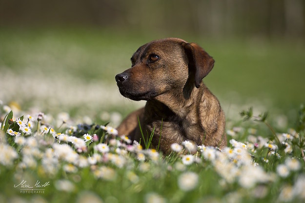 "Das ist mein Hund? Ich wußte gar nicht, dass er so schön ist." Eigentlich sollte nur der Hundefreund dieses Dackelmischlings fotografiert werden, weil besagter Mischling ja nicht so schön wäre. Wobei ich der Besitzerin hier recht geben musste. Hatte dieser rumänische Straßenhund doch wirklich einen etwas schlecht proportionierten Körper und Dackel-O-Beine. Aber weil diese Blumenwiese so schön war und er nunmal auch herumstand, liess ich ihn gleich mit in die Wiese ablegen. Umgarnt von schönen Gänseblümchen war vom Nicht-Topmodel-Körper auch nichts mehr zu sehen, dafür umso mehr von seinem lieben Gesicht.