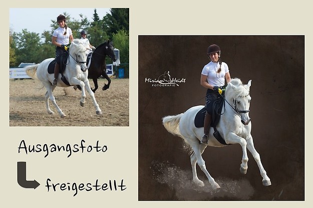 Sie haben die Wahl: möchten Sie es klar und übersichtlich, mit neutralem Hintergrund oder einem Foto als Hintergrund. Oder möchten Sie es bunt mit großer Vielfalt. Oder wünschen Sie eine exklusive, freigestellte Collage. Hier wird der Hintergrund bei jedem einzelnen Pferd aufwendig entfernt und die Fotos zusammengesetzt und mit einem neuen Hintergrund versehen. Zur Inspiration finden Sie hier einige Beispiele.